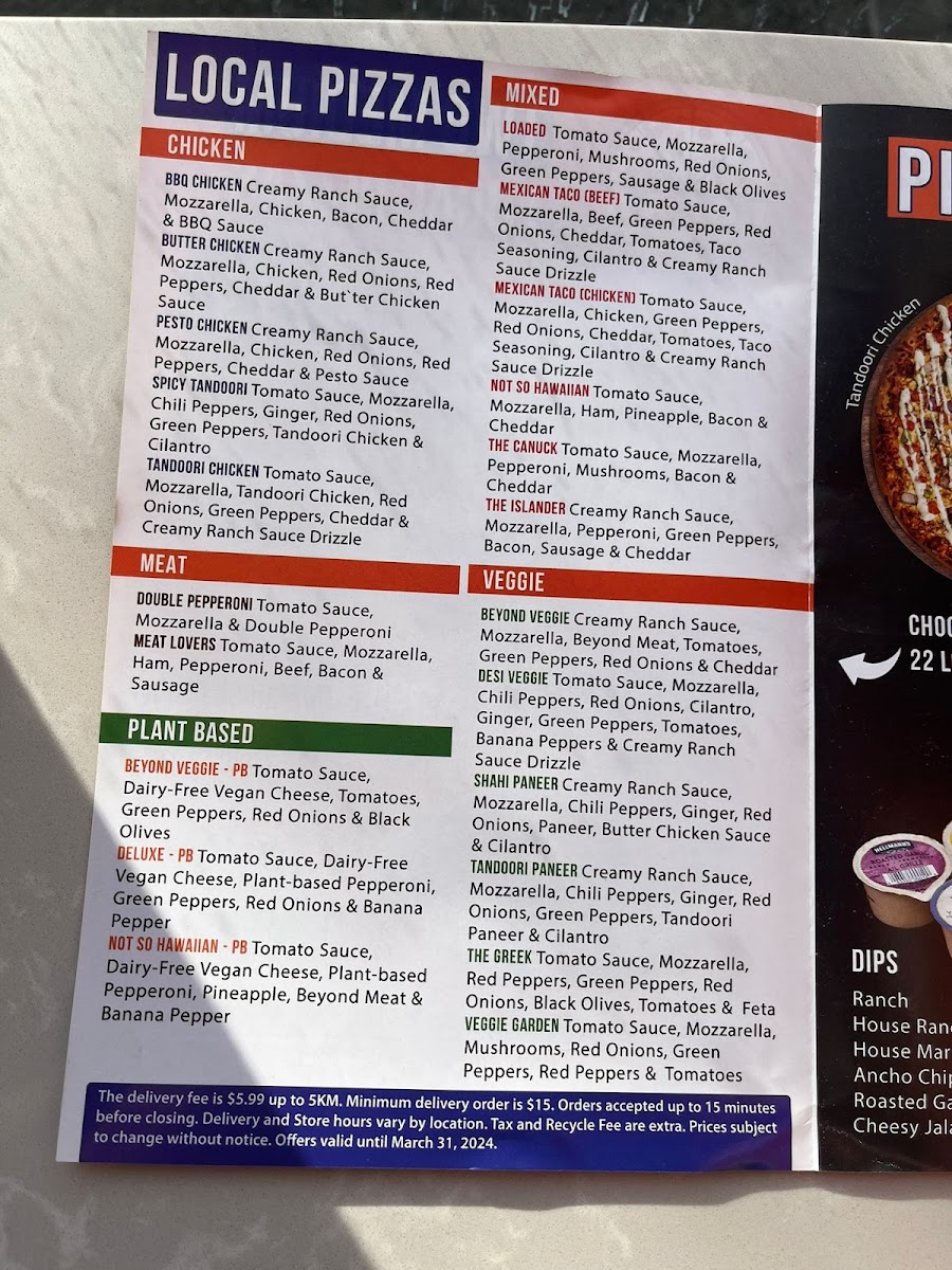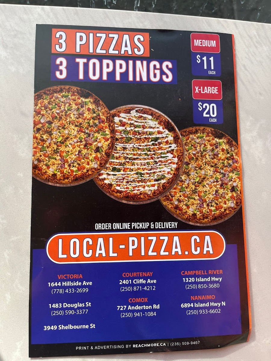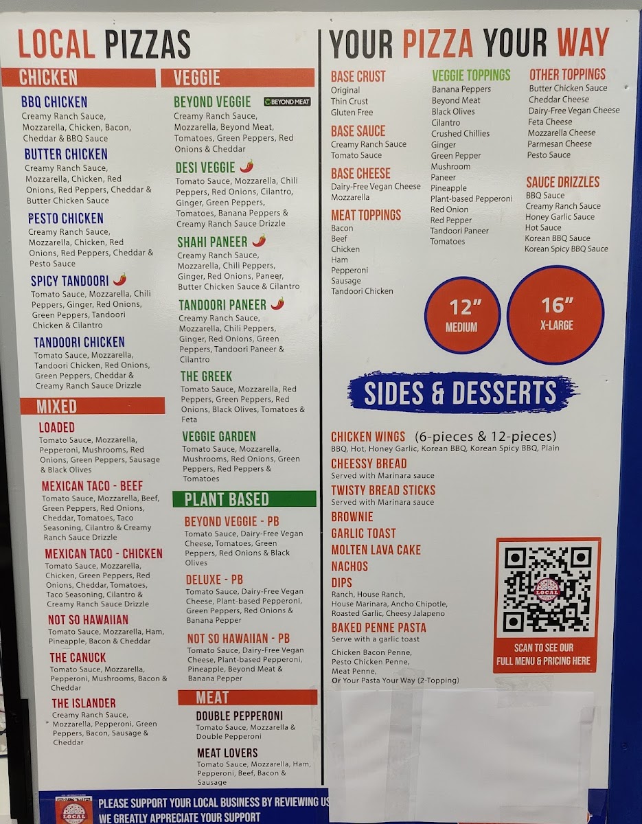 The menu at LOCAL Pizza - Shelbourne St offers a variety of pizzas, sides, and drinks designed to cater to casual dining and quick orders. Central to the menu are customizable pizzas available in medium (12") and extra-large (16") sizes, with options for half-and-half toppings. Customers can choose from a range of toppings to create their own pizza combinations.
